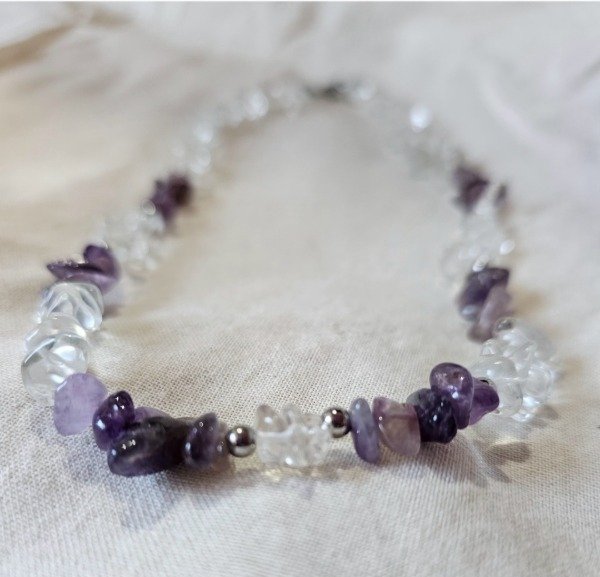 Collar realizado con escallas de piedras naturales de cuarzo cristal y escallas de amatista, combinadas entre sí con perlitas de acero quirúrgico.